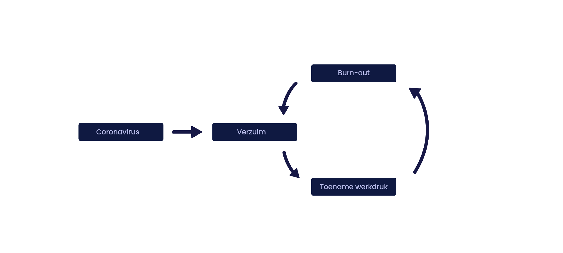 Doordat het moeilijk is om personeel te vinden, worden vacatures niet vervuld en moet hetzelfde werk met minder mensen worden gedaan. Dit zorgt voor een hogere werkdruk en leidt indirect tot extra uitval. Ditmaal door overspannenheid en burn-out. Het hoger ziekteverzuim zorgt zo voor personeelstekorten.