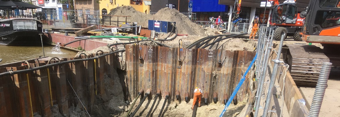In 2016 werden de eerste gebouwen gesloopt om ruimte te maken voor dit project. Arjen: “Gedurende die sloop zijn de riolering, kabels en leidingen meteen verlegd.” Maar er is nog veel meer ondergronds dat letterlijk in de weg ligt. Het kanaal kruist een weg, daar komt dus nog een brug. Voor de leidingen onder deze weg wordt, in overleg met het nutsbedrijf, een zinker gemaakt. En dan is er nog de markt. Almelo heeft twee keer per week markt in het centrum. De marktlui zijn tot veel bereid, maar iedere week verkassen door werkzaamheden is te veel gevraagd. In samenspraak met de aannemer is er een fasering bedacht waar alle betrokken partijen zich in kunnen vinden.