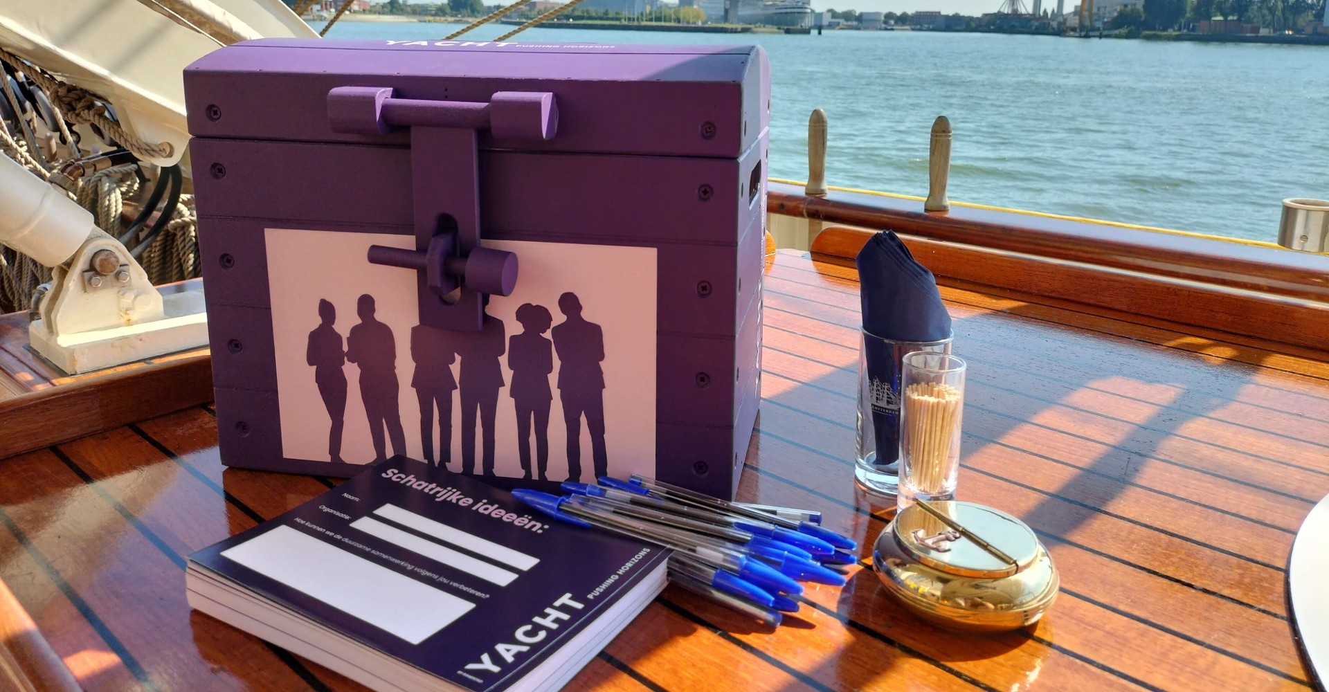 Nu ontstaan mooie gesprekken over uitbreiding van de samenwerking, terwijl het schip op een grootzeil door de Maas glijdt. Op de achtergrond vragen de trekpleisters van de stad, zoals de Euromast en de Erasmusbrug, tevergeefs om aandacht. Er is hier teveel te ontdekken, beleven en proeven. Geroosterde pompoensoep, bruschetta met humus, vlindergamba’s, tonijn met wakame, vegetarische dumplings en natuurlijk bitterballen. Ook de driekoppige barcrew draait verhitte overuren, aangezien iedereen dorst heeft in deze tropische hitte. De voorplecht is wat dat betreft de beste plek, omdat daar een stevige, verkoelende bries waait. Toch staan en zitten overal op het schip plukjes mensen. Connecties ontstaan, plannen worden gesmeed.
