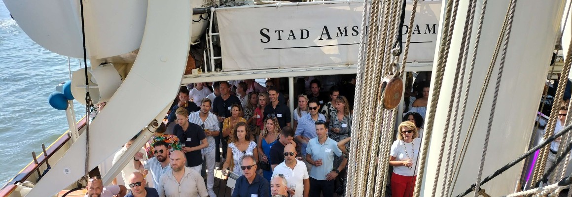 Vandaag zet Yacht deze toppers letterlijk en figuurlijk in het zonnetje: het kwik tikt de 30 graden aan. Gelukkig zijn de gasten het zweten gewend. De appeltaart die de crew bij binnenkomst serveert vindt weinig aftrek, de koele drankjes des te gretiger. Al voor afvaart leggen de gasten contact met elkaar, wisselen kennis en ervaringen uit en bewonderen de driemaster die na deze week minstens twee jaar de wereldzeeën zal bevaren. Dan verschijnt op het bovendek operationeel directeur Jan van Helden voor het openingswoord, waarin hij snelheid aan samenwerking koppelt. “Laatst mocht ik tijdens de Grand Prix van Zandvoort een kijkje nemen in de garage van AlphaTauri. Fascinerend hoe daar tientallen mensen kriskras door elkaar liepen en toch precies wisten wat ze deden. Elke dag werken daar honderd specialisten samen om die ene coureur zo snel en succesvol mogelijk te maken. Zo zie ik onze samenwerking ook. Wij vanuit YIS en YEM als de teamleiders en jullie als onze onvolprezen financiële, commerciële en technische teams met het grote talent. En wie het talent heeft, heeft de markt. We zijn jullie zoveel verschuldigd!”