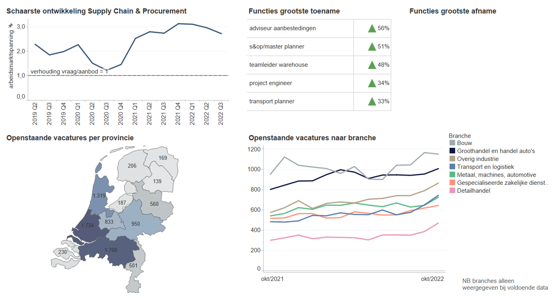 De supply chain disrupties van de afgelopen jaren – corona, Oekraïne, het huidige tekorten aan grondstoffen – hebben functies als die van inkopers, transportmanagers en supply chain managers flink belangrijker gemaakt. Hier lijkt de onbalans tussen vraag en aanbod lijkt alleen maar groter te worden. Kwaliteit en flexibiliteit zijn bij inkoop, in de supply chain, voorraadbeheer en productie essentieel geworden, met over de hele linie 20+ procent groei in het aantal openstaande vacatures. Alle onzekerheden in productiebedrijven hangen samen met inkoop. In een normaal functionerende wereld weet een bedrijf wat het kan verwachten: dan veroorzaken Kerst en Koningsdag de bekende pieken. Maar als alles onzeker is en seizoenen niet meer te plannen zijn, dan bouwen bedrijven op supply chain professionals. Detail: ook contract managers hebben een zeer gewild métier, met name bij de overheid. Deze behartigen met name bij de overheid het sociale/relatie-aspect van de contracten. Er is heel veel vraag naar professionals die dit aspect beheersen.